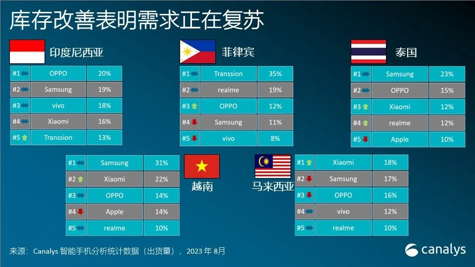 Canalys分析师周乐轩表明,当季出货量的走低标志着东南亚区域遭受接连六个季度的下滑。各大品牌在本季度仍坚持慎重,侧重加强途径建造,布局长时间的可持续开展。因为非Pro 版的iPhone 14 版的库存调整受挫,苹果加大途径鼓励力度。一起,三星也标准途径库存,跟着旧机型的打折,导致产品定价不稳定和供给紊乱,因而三星中低端机型面对“相互蚕食”的难题。与此一起,凭仗专心于二线城市的途径鼓励办法,其子品牌Infinix和Tecno采纳的免费附赠、扣头和价格亲民的低端机型等行动,使得传音成为仅有添加的厂商,陡增31%,初次闯入前五。 虽然同比下降26%,但三星在A系列的热销下仍领跑东南亚商场,出货420万部,获得20%的商场比例。OPPO排名第二,出货量达340万部,商场比例达16%。OPPO加强旗下Find和Reno系列的品牌知名度,并在马来西亚和泰国等商场扩展运营商的脚印。小米和传音出货量均为290万部,别离获得14%的商场比例。小米最新发布的红米Note 12系列成为要害动能。传音在马来西亚、泰国和印尼的商场比例完成添加,一起稳固了在菲律宾的领先地位。得益于新近发布的C系列的成功,realme重回第五,出货量达260万部,商场比例12%。