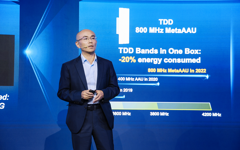 场景上,超宽带从宏站拓宽到微波和DIS,微波新2T ODU,800MHz带宽完成更多载波聚合,功耗同比业界下降50%;超宽频LampSite,完成2GHz带宽,整站能耗下降40%。